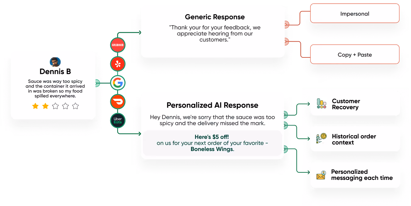 The AI Review Management Agent delivers personalized replies, turning complaints into recoveries and happy customers into loyal advocates. By curating order-level responses and automating at scale, every customer feels heard, building trust and repeat visits.
